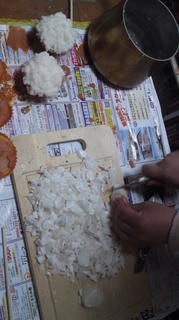 ろうそくを細かく刻み⇒鍋にかけとかし⇒色つけはクレヨンを消る