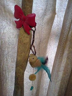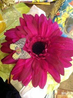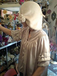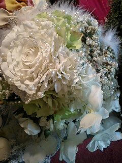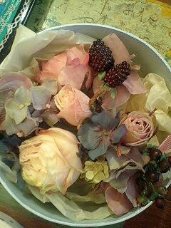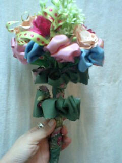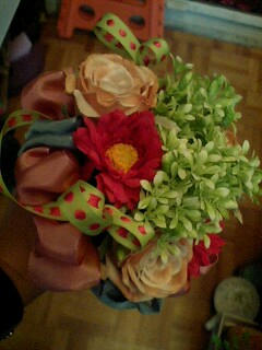 を花のようにワイヤーでまとめ、入れ込んであげて 茎の部分はアンティーク生地のようなモスグリーンのバラ模様の生地を切ってリボンのように巻きつけました