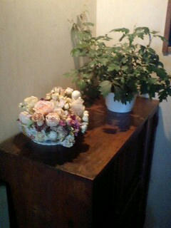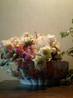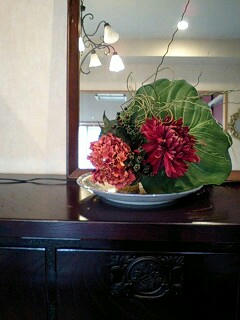 私は菊や紫陽花を 凛とみせたくて茎を 長く活けてみました。活け終わって橋本さんにタビィさん これを見てどう思いますか? と質問され、私は二つの事を感じました。 一つは思いを込めて活けた作品、 生花に見えるかも…。 もう一つはやっぱり布花に見えてしまう…。生花に見えてほしい! という気持ちがどんなにあってもその作品は生花にはなりませんでした。 橋本さんが「 タビィさん布花には布花のよさがあるんだよね。無理に生花に見せようとしないでいいんじゃないですか。じゃあテーマを変えてみましょう。 布花を生花のように活けるから布花をより自然に近く 活ける」そのテーマで活けたものがこの作品です。私は初めて布花を活けたお皿に水をはり 自宅に飾ってみました。 来てくださったお客様も最初は布花だとは わからず 感動してくださいました。 これからも 生花でレッスンを受け、枝のしなりや 枝の陰、陽をみながら 自然の恵みを見つめながら いずれ 布花やドライフラワーにもそんな見方が出来るように アレンジできたらと思っています。 自宅でもっと花と触れあう時間を皆さんにも知っていただけたらいいなと思っています。 |