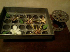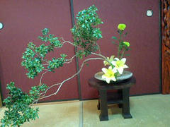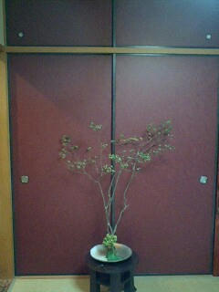 今月はぼろぼろなっていた障子も張り替え、綺麗になったついでにふすまも張り替えました。 日がとてもあたり、日焼けするので 思い切って茶色を選びました。最初棟梁に頼んだ時には 店でもないのに 変だ! こんな色今までやったことが ねえー!くらい少しご立腹な棟梁になんとか 思いを告げ 貼っていただきました。 部屋に入れてみるとなかなかよろしいではありませんか。 生け花を習っている私にとって とても良いバックです。 背景が濃くしまっているので 前に生けた花の緑が一層きれいに見えますね。