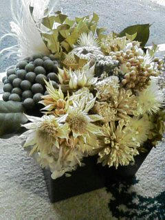 黒のレザーの器にオフホワイトをメインにしたドライフラワーを沢山入れアレンジしました。男性に送るにはピッタリかな!